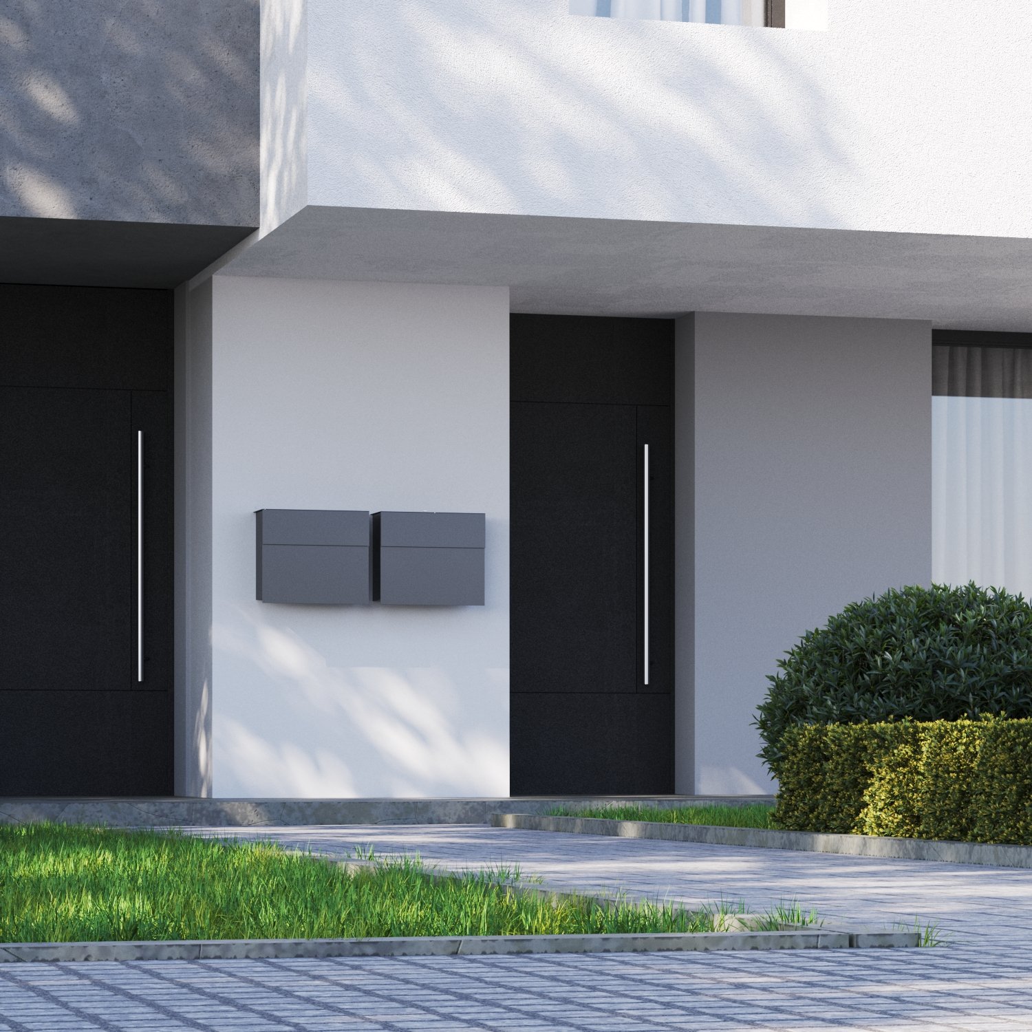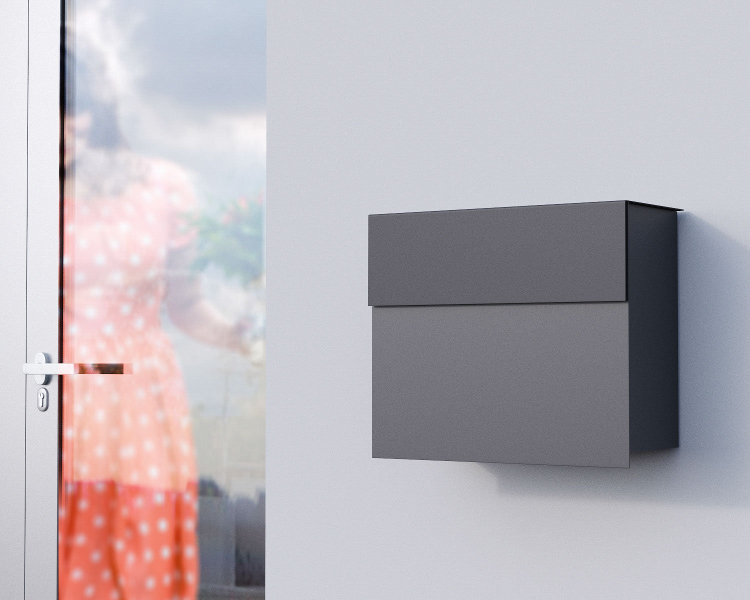 Juodos spalvos „Molto“ dizaino pašto dėžutė. Nepaisant didelės talpos, „Molto“ pašto dėžutė pasižymi aiškiomis linijomis kraštovaizdžio formatu. Užraktas paslėptas po dangteliu, kad būtų apsaugotas nuo oro sąlygų. Ši laiškų dėžutė įdedama ir išimama iš viršaus arba iš priekio per priekinį atvartą ir pritvirtintą įdėjimo atvartą. Sieninė pašto dėžutė „Molto“ – tai lanksti individuali pašto dėžutė, skirta montuoti ant paviršiaus.